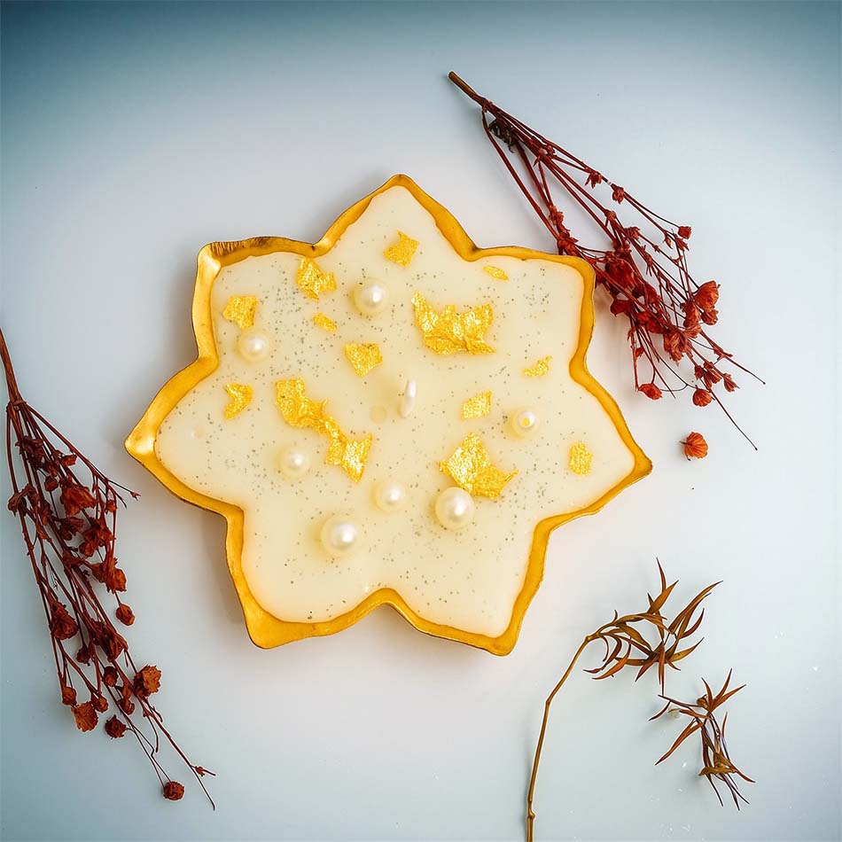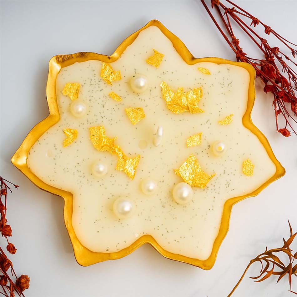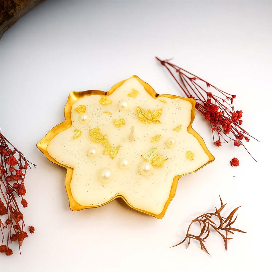 Add fragrance and elegance to your celebrations with our 7-Petal Scented Urli Candle. Hand-poured in a beautiful golden floral design, this decorative candle not only adds a touch of elegance to your home but also fills the air with a soothing aroma. Perfect for Diwali décor, festive occasions, or daily home styling. This scented urli candle creates a warm and welcoming ambience, making it a thoughtful choice for gifting loved ones or enhancing your own living space.